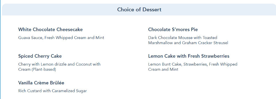 Dessert selections include White Chocolate Cheesecake, Spiced Cherry Cake, Chocolate S’mores Pie, and more. Again, a few desserts have swapped from last year while other remain.