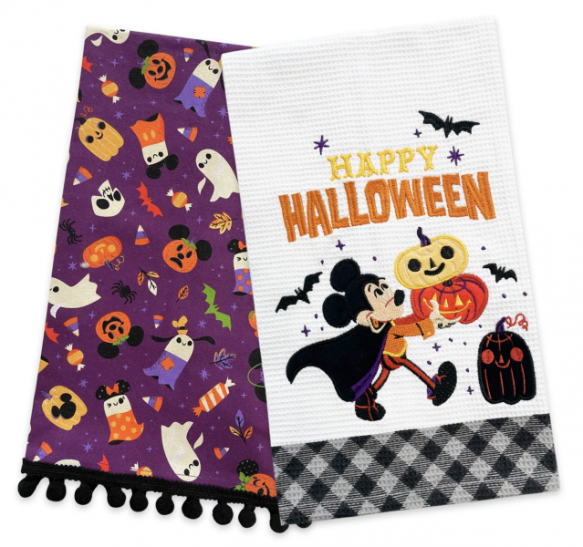 This set of two towels includes two different prints with one towel featuring an embroidered Mickey in his Halloween costume, and the other towel is designed with a purple print of Mickey pumpkins and ghosts!
