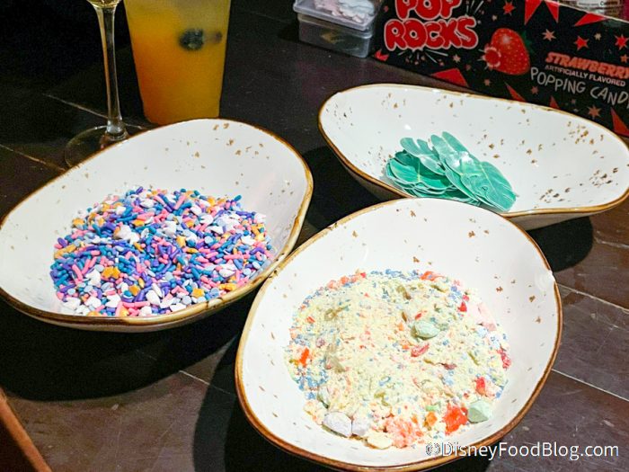 We could choose from some super fun toppings, like Rainbow Drops, Explosion Candy (aka Pop Rocks), and Unicorn Dust. Is this the most fun boozy snack ever? We think it might be!