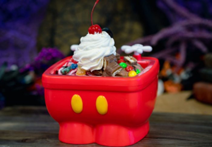 - Halloween Candy Sundae – Two sundaes in one: sour gummy ice cream with raspberry sauce, gummy treats, and fruit candies; and chocolate ice cream with hot fudge and pieces of chocolate candy bars