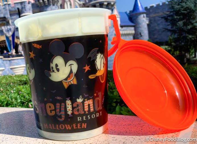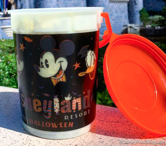 The bright orange lid complements the dark bucket, and it also says “Disneyland Resort Happy Halloween.”