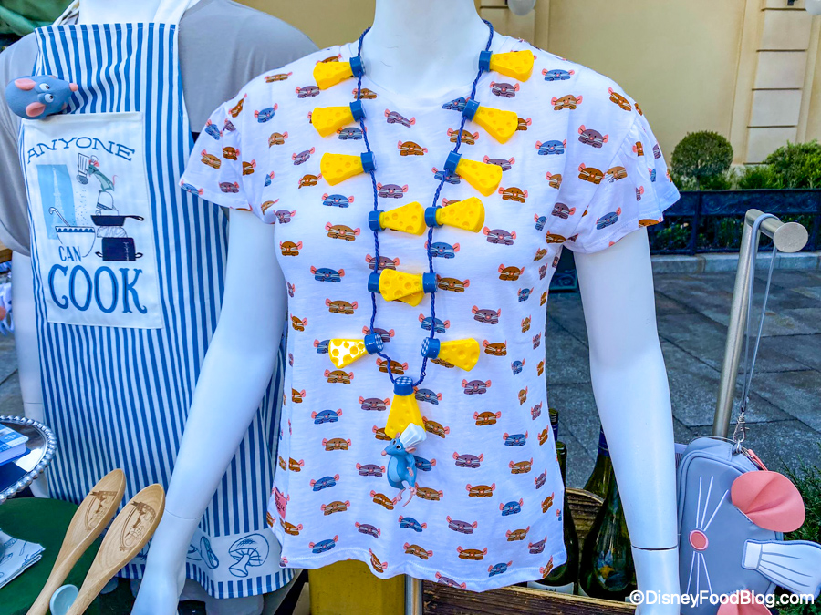 There was also a lovely apron and a shirt patterned with the ride vehicles! And yes, that IS a cheese necklace on display!