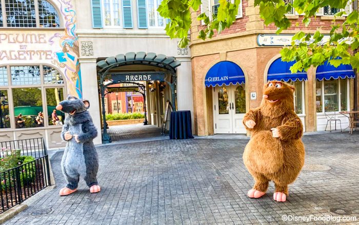 We’re hanging out at the France Pavilion in EPCOT today with Remy, Emile, and Gusteau!