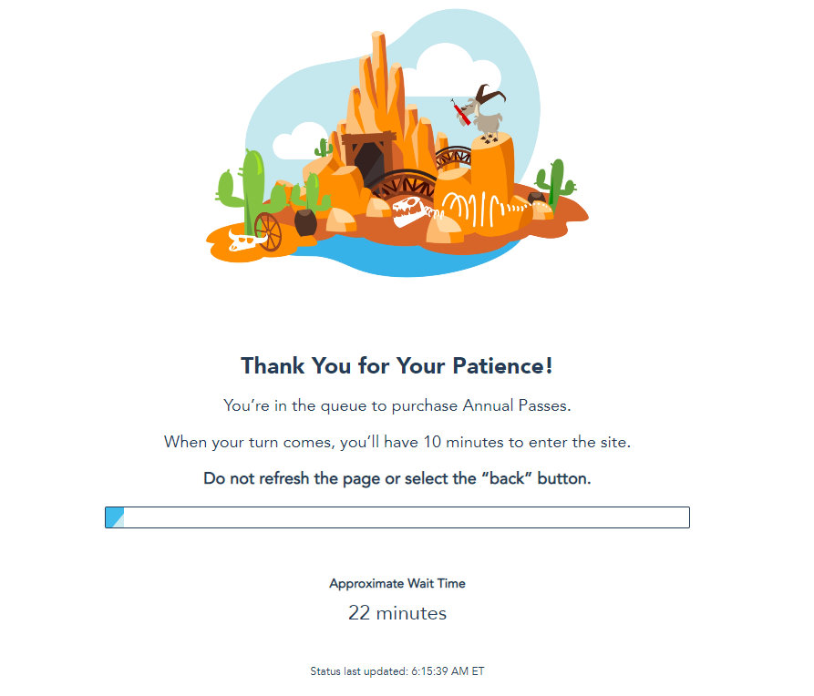 Depending on what time you visit the Disney World website to purchase an Annual Pass, you may enter a Queue. (This screenshot was taken at 6:15AM EST, for example.)