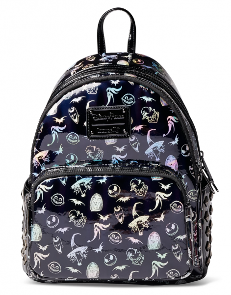 On shopDisney, you can now purchase both The Nightmare Before Christmas ears AND a new Loungefly mini backpack! The mini backpack is $80, and it features an iridescent pattern of Nightmare Before Christmas characters and three zippered compartments. We can spot Jack Skellington, Sally, Lock, Shock, Barrel, Zero, and Oogie Boogie along with bats.