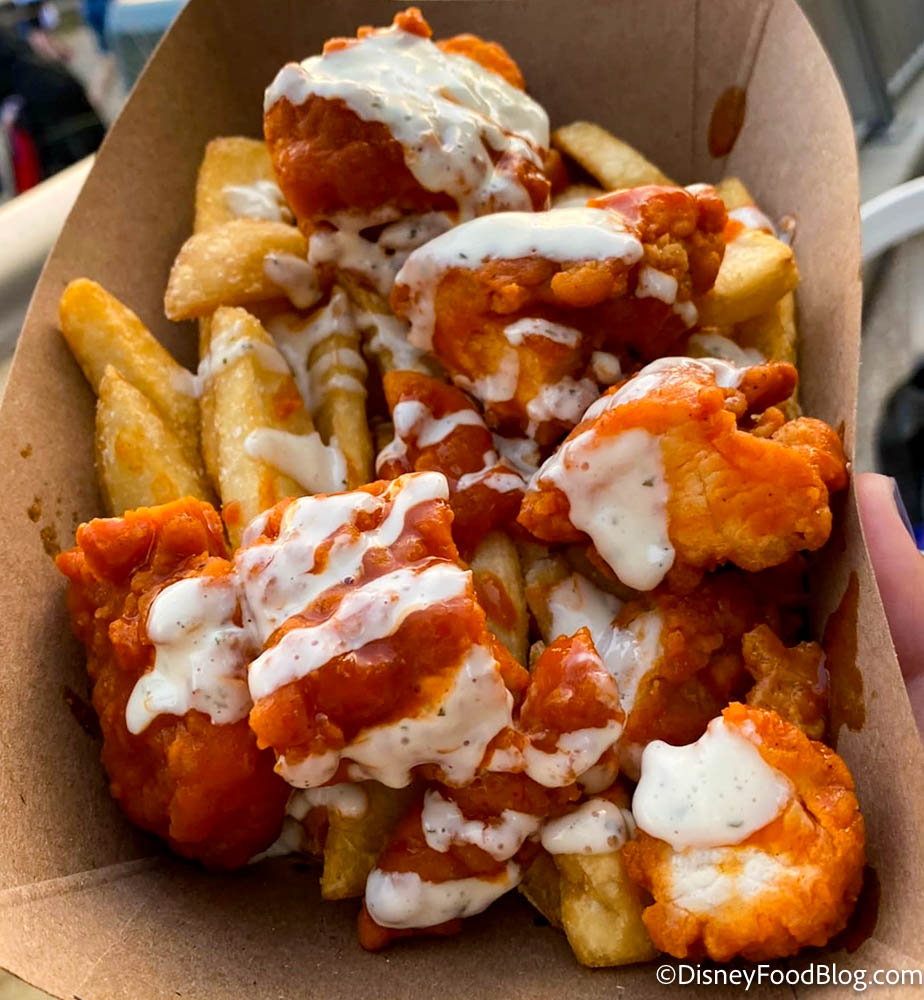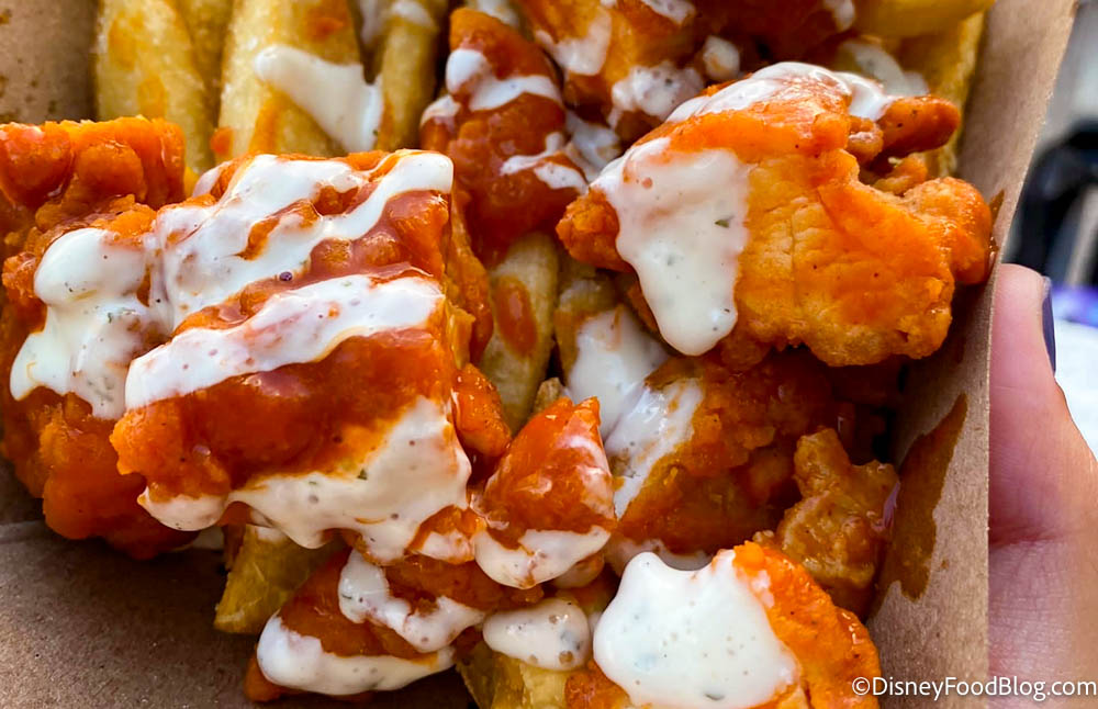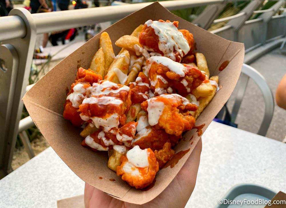 The event has fun entertainment, plenty of villainous characters, and — of course — Halloween treats galore. One counter-service spot is serving up THREE different kinds of loaded fries, and we’re here to try them all. Let’s take a closer look at the new Loaded Buffalo Chicken Fries!