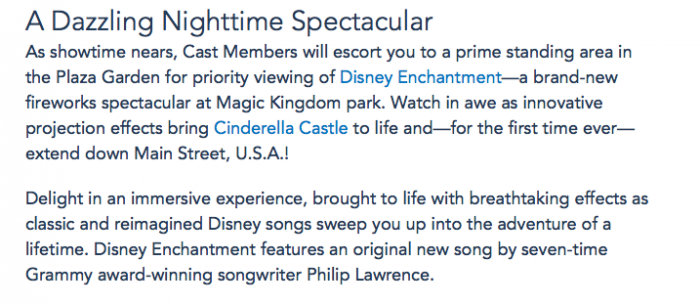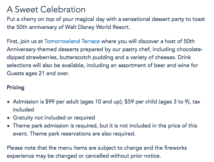 This is similar to the Fireworks Dessert Party — Plaza Garden Viewing option that was available in Magic Kingdom before. This was previously priced at $79 per adult and $47 per child, so this updated offering is a bit more expensive at $99 per adult and $59 per child.