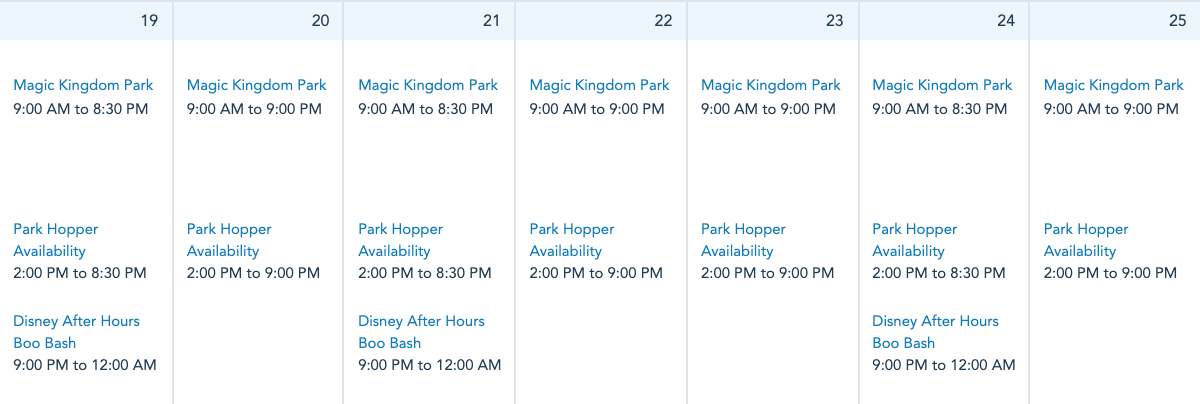 Magic Kingdom will be open next week from 9AM-8:30PM on the days that it’s hosting Disney After Hours Boo Bash, which are Sunday, Tuesday, and Friday. On Tuesday, Wednesday, Thursday, and Saturday, the park will be open from 9AM-9PM.
