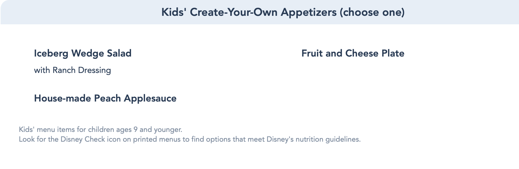 The Kids’ Menu is available to children nine and younger for $37 and the appetizers include Iceberg Wedge Salad, Fruit and Cheese Plate, and House-made Peach Applesauce.