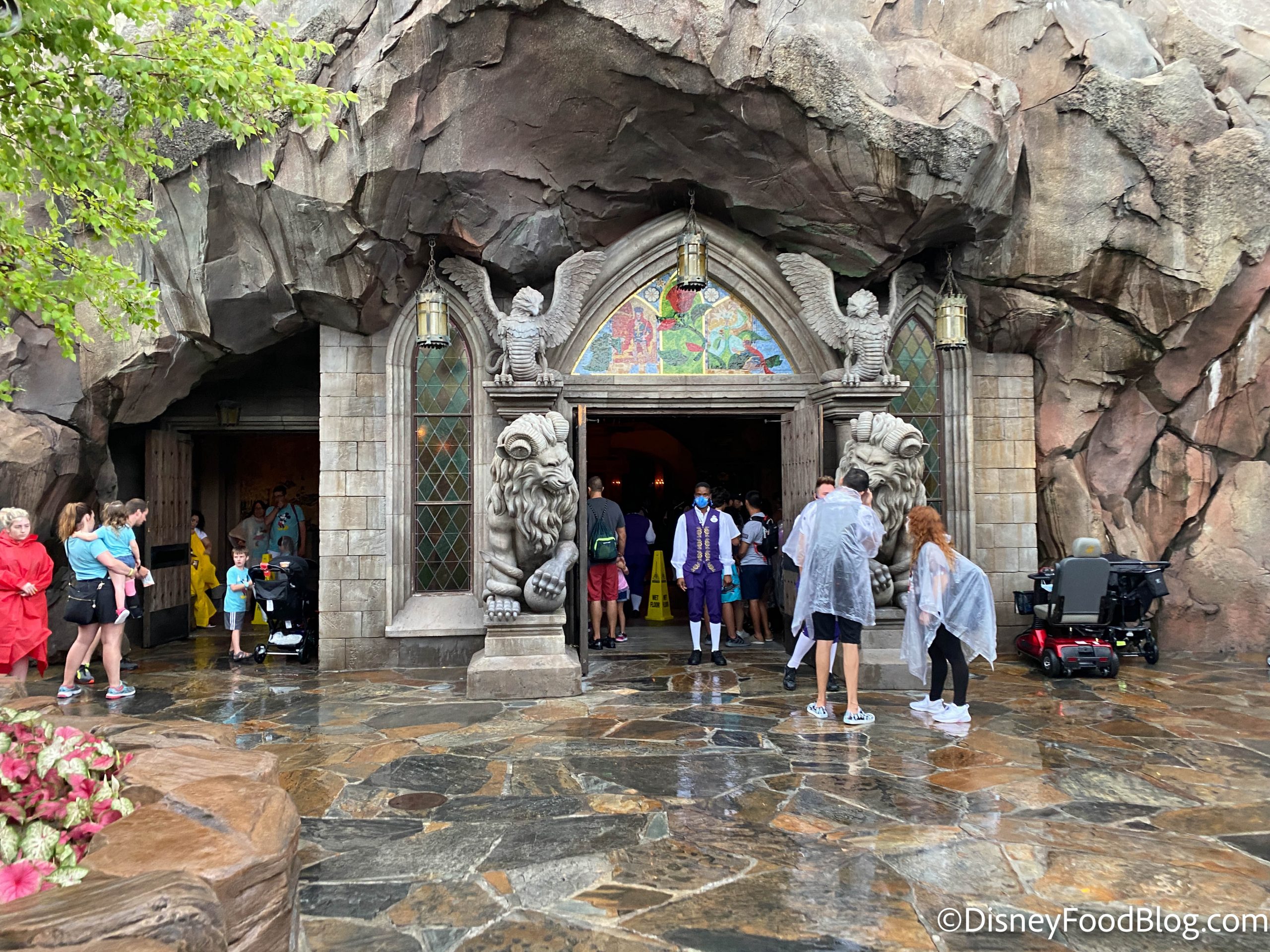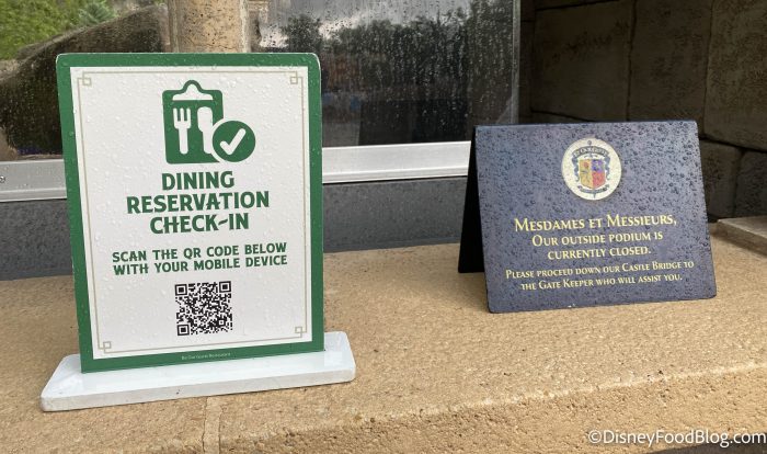 Usually, Be Our Guest Restaurant check-in is located outside at the end of the Castle Bridge. On this rainy day, check-in was moved inside.