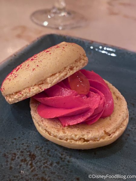 And finally, it was time for the Dessert Trio (and Enchantee Champagne!). The Dessert Trio includes a Lemon Jam Macaron, a White Chocolate “Chip” Cup, and a Dark Chocolate Truffle. Last time we ate this, it was served on edible sugar “paper” printed with a pretty stained glass rose design. We were sad to see that missing this time!