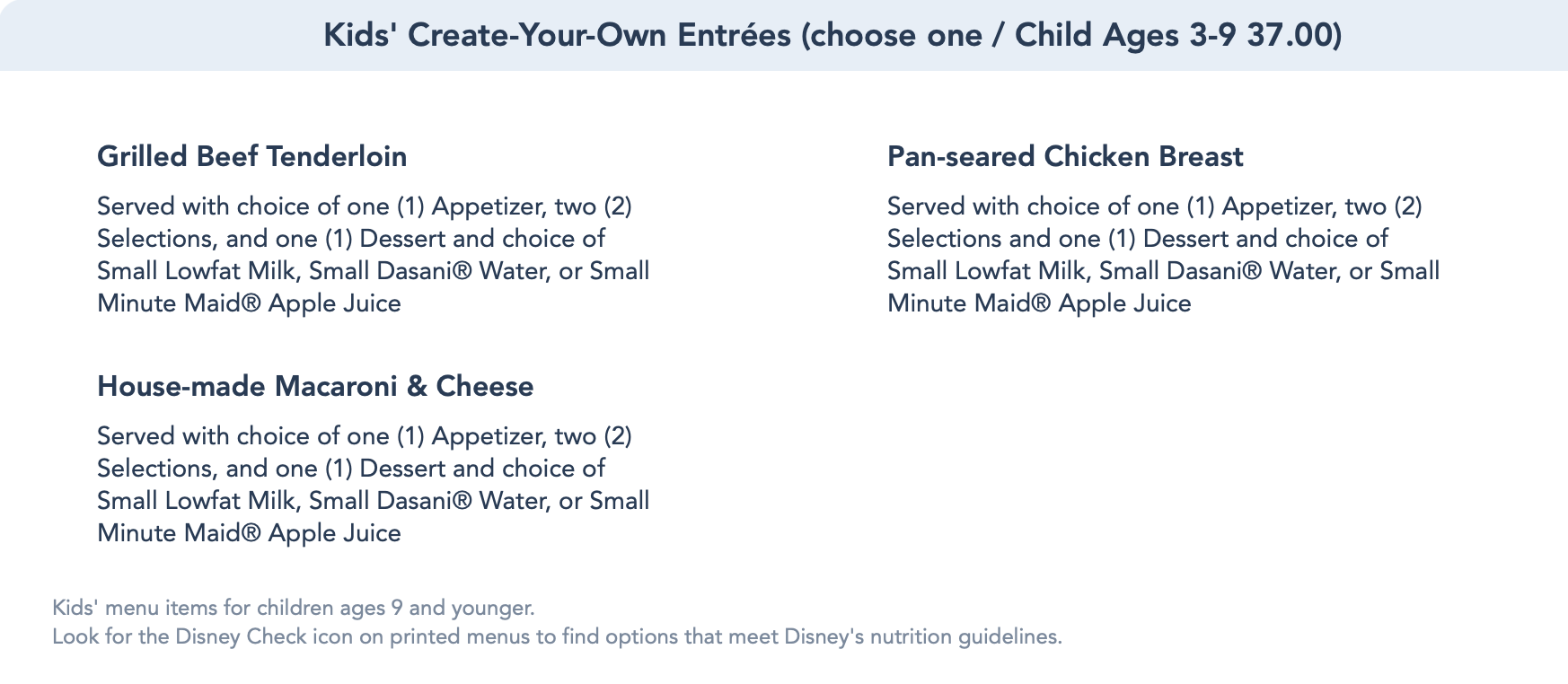 Kids’ menu entrees feature Grilled Beef Tenderloin, Pan-seared Chicken Breast, and House-made Macaroni & Cheese.