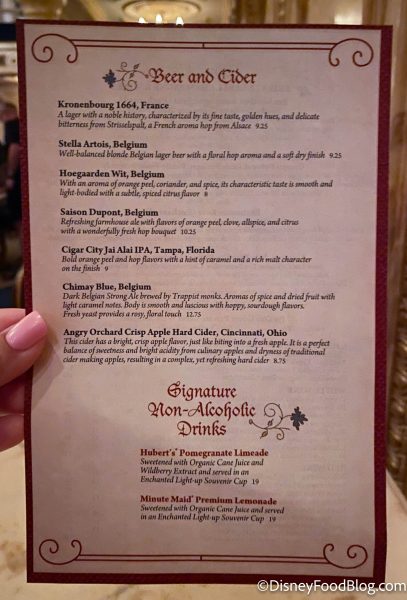 If you’re looking to get extra fancy, the Private Label Champagne and Wines list an Enchantée Champagne Brut, L’ombre de la Bete Chardonnay, Enchantée Rose, and L’ombre de la Bete Vin Rouge, as well as the Be Our Guest Private Label Wine Sampler.