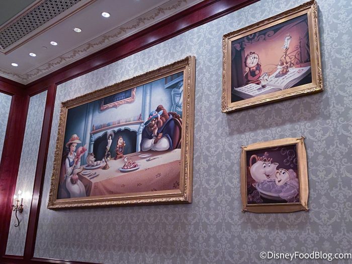 One of the other rooms open for dining is the Rose Gallery, in which you can find Belle and the Beast dancing on a giant music box, along with portraits from Belle and the Beast’s life. Fun fact, the story is that the music box was a wedding gift from Maurice, Belle’s father, to celebrate their love story.