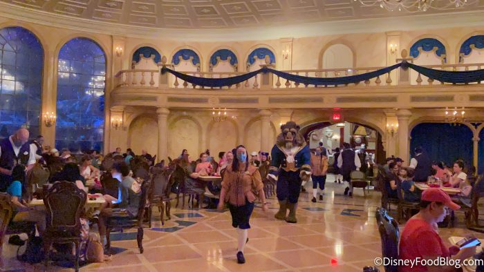 Previously, guests could line up to meet and take photos with the Beast in his study near the entrance and, because he’s a rare character to find in Disney World, this was a perk of dining at Be Our Guest Restaurant. Now, the interaction with Beast is limited to him walking through the dining rooms. But we were able to see the Beast three times during our meal and again as we were leaving! Be aware that the location of your table could impact how well you can see the Beast. He tends to stick to the main walkway through the space.