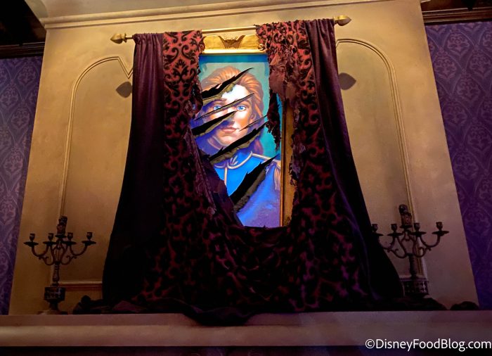 The Prince’s clawed portrait is the centerpiece of the room, and loud thunder and lightning add to the foreboding setting (so take note if you aren’t a fan of loud sounds!). This room tends to be a liiiiiiittle on the spooky side and we’ve seen some kids prefer to NOT sit in here. If you’ve got little ones with you, decide if this room is OK for your family. If not, just let the hostess know. If you keep your eye on the Prince’s portrait in here, you might spot it change!