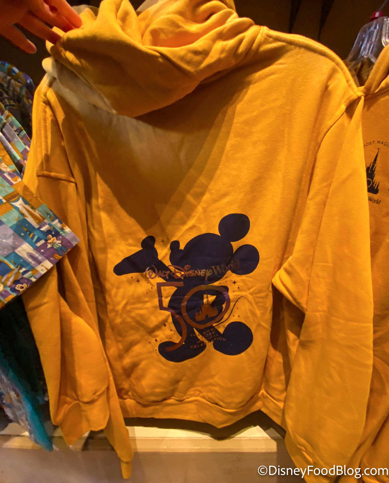 And this fun 50th Anniversary Hoodie comes in a mustard color with the 50th logo on the front and a Mickey silhouette on the back.
