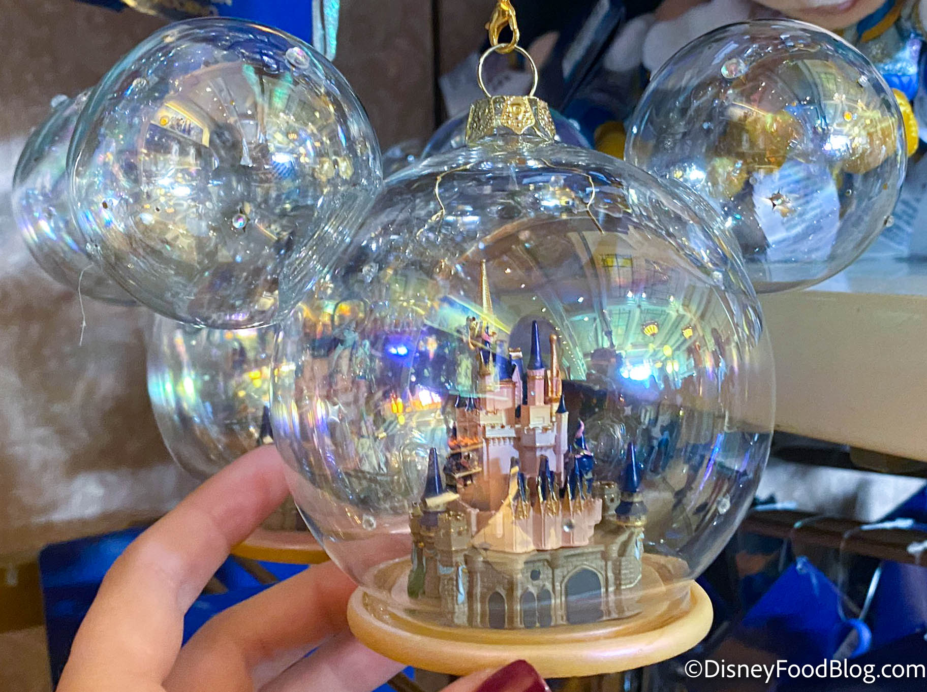 This clear Mickey-shaped ornament has Cinderella Castle inside it for $29.99.