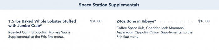 Space Station Supplementals are not included in the prix fixe price, but you can order a 1.5 lbs Baked Whole Lobster Stuffed with Jumbo Crab or a 24oz Bone in Ribeye for an added cost.