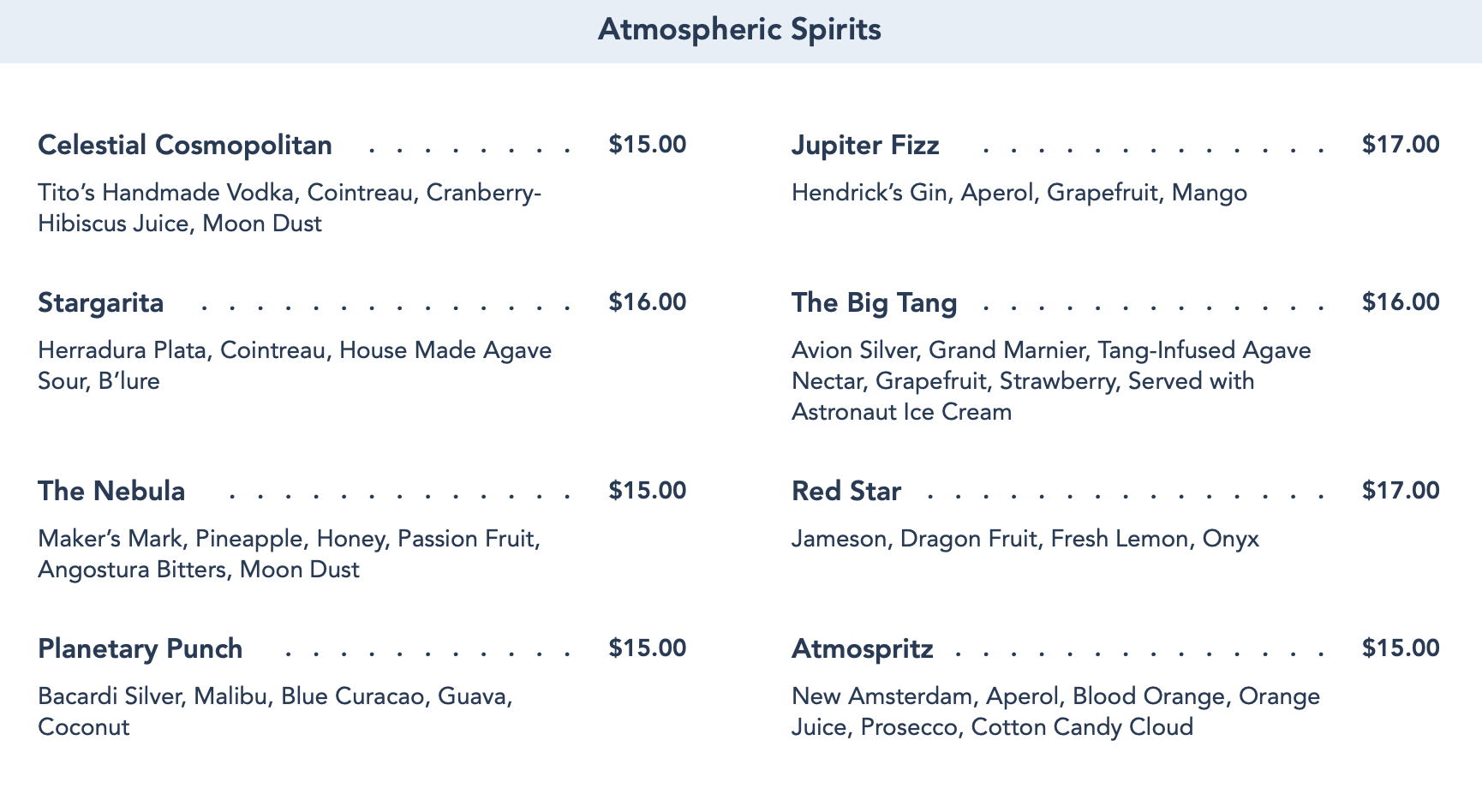 Adults can order beer, wine, or special Atmospheric Spirits as an add on to the price of their meal. Recently, a Space 220 Cast Member indicated that standard non-alcoholic drinks like soft drinks are NOT included in the meal, so keep in mind that it will be an extra cost. The drinks are the same between the lunch and dinner menus.