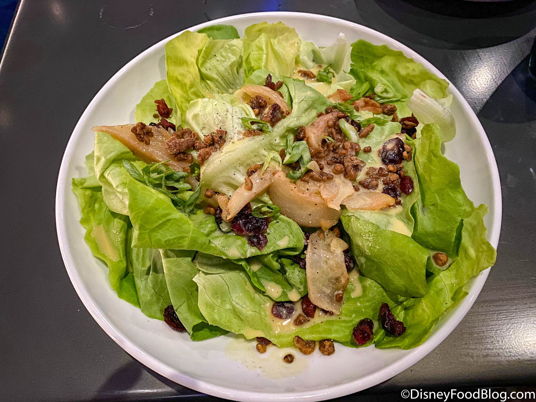 The Space Greens totally surprised us; we thought this dish was really good! This dish includes Bibb Lettuce, Dried Cranberries, Roasted Pears, Spiced Pecans, and Apple Cider Dressing.