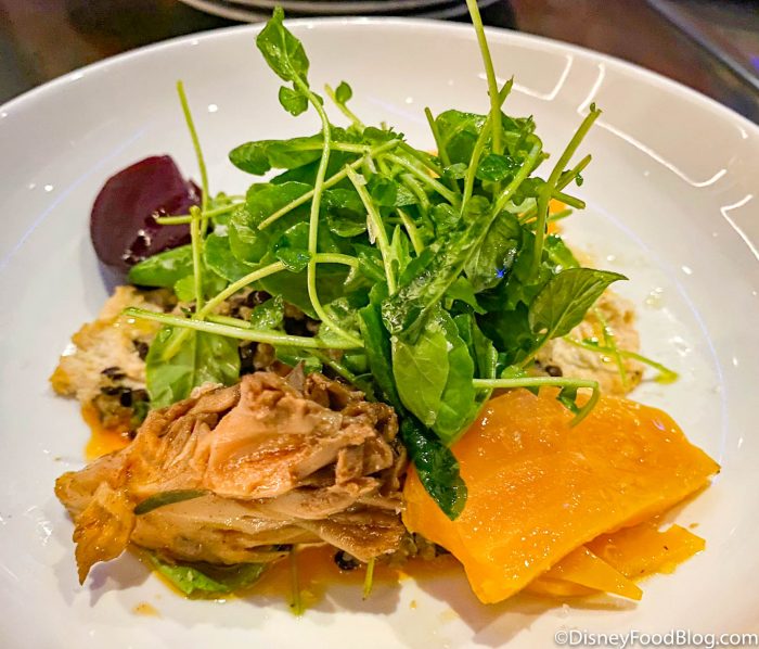 Of all the appetizers we tried, we found the Galaxy Grain Salad to be our least favorite — but it wasn’t because it was the plant-based dish! This dish comes with Quinoa, Beluga Lentils, Roasted Red and Golden Beets, Oranges, King Oyster Mushroom, and Cashew Hummus.