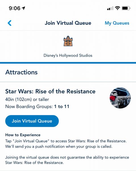If you miss your morning opportunity, you can try again at 1PM, once you’re inside EPCOT. You must have scanned into the park in order to try for a boarding pass in the afternoon. If you secure a boarding pass at either time, it will show up in your virtual queues on the app, and you’ll be given a group number and a countdown to when you should arrive at the ride.