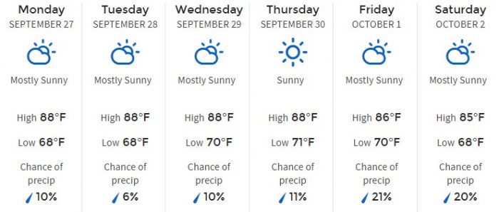 For Thursday, September 30th, we’re seeing a day with another consistent prediction of temperatures in the high-80s and a beautiful evening at 71 degrees.