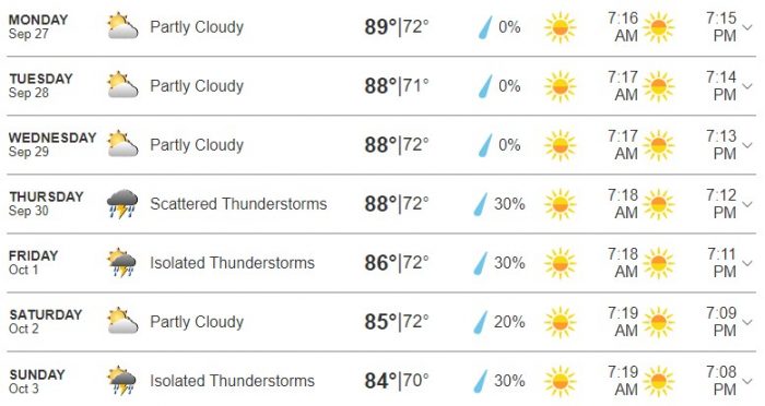 Here is a full overview of the week according to The Weather Channel. Temperatures are projected to hang out in about the same place for the whole week again (but cooler than usual!). We’re looking at a range of 80s highs and 60s to 70s lows.