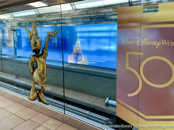 On the clear walls surrounding that train, you can see images of gold Disney characters, 50th Anniversary banners, and an EARidescent Cinderella Castle with the “50” logo.