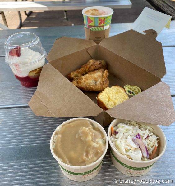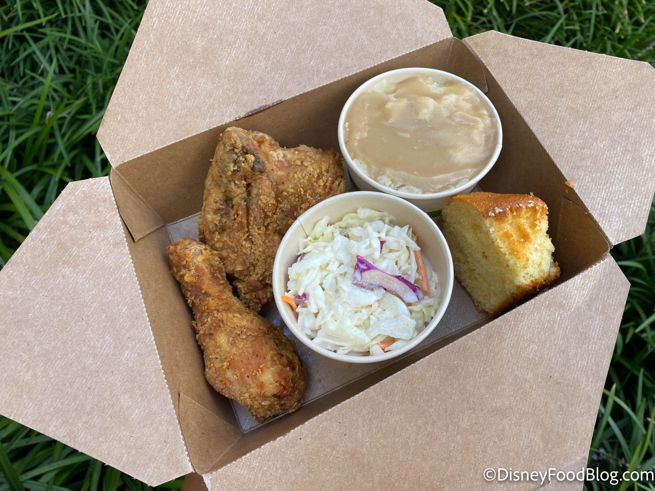 The fried chicken is the same classic recipe you’ll get at Hoop-Dee-Doo Revue and that used to be served at Trail’s End, both also on-site at Fort Wilderness. We were glad to see that we received dark meat, a drumstick and a thigh, which means more flavor! Juicy and tender and coated in the crispy, seasoned breading, this fried chicken is some of the best in the wilderness. We ate ours soon after receiving it but we suspect if you left it in the box too long transporting it, your chicken might get a little soggy. Just something to keep in mind if you want maximum chicken crunch (and really, who doesn’t?).