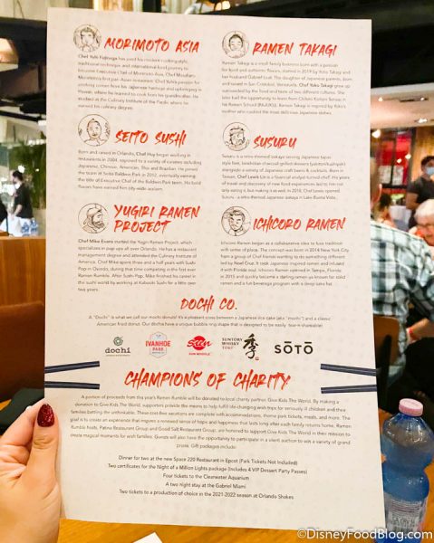 Overall, we had a wonderful time at this event. The $80 ticket price seems fair for the six bowls of ramen, drink, and dessert that you get — plus, it’s for a good cause! It was a well-organized evening and the competitive aspect made for a unique event. If/when the Ramen Rumble returns next year, it may be worth a visit for big ramen fans. If you’re looking for a unique night out in Disney Springs, keep an eye out for the 5th Ramen Rumble!