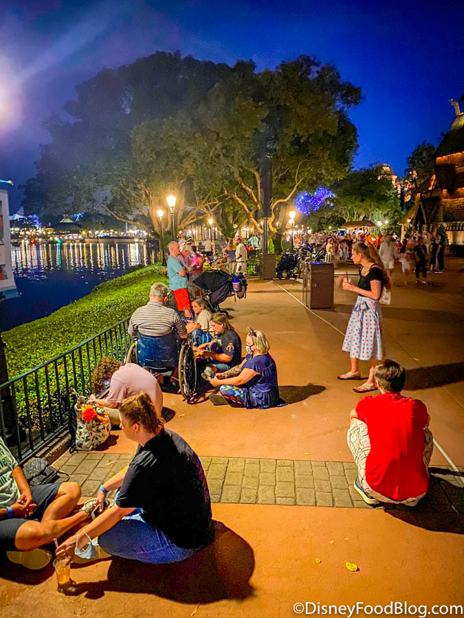 So if you weren’t able to get a good viewing spot for Disney Enchantment tonight, come on down to EPCOT! We’ve got plenty of room for you over here! We still have some time before the show starts, so the crowds might fill in a bit more prior to the show. But as of now, there seems to be thinner crowds and much more personal space!