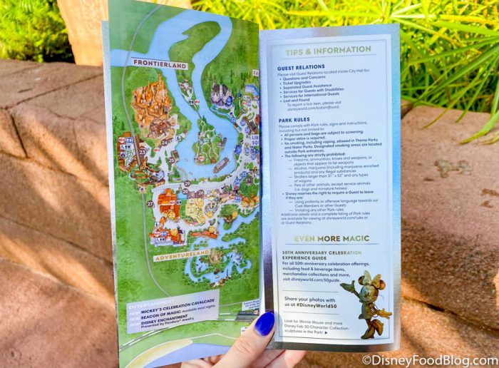 Inside you’ll find a “Tips and Information” page with information about guest relations, park rules, and a website that guests can visit to learn all about the 50th Anniversary Celebrations.