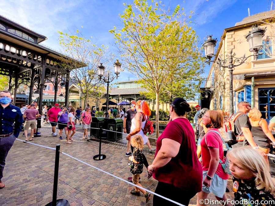 There were also people in line to get on the new ride, Remy’s Ratatouille Adventure. You have to have a boarding pass to ride Remy’s and all of the boarding passes from the 7AM drop were booked up VERY quickly! Another round of passes will be released at 1PM today for people already inside EPCOT.