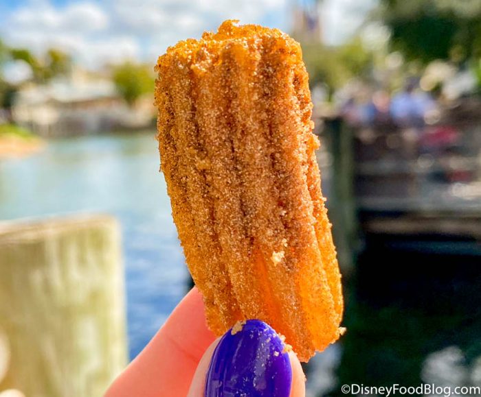 Except…we are often disappointed with Disney World churros. They’re okay, but they’re nothing like the fresh ones we’ve had at Disneyland. These are pretty much the same mini churros Pecos Bill always has, so there’s nothing THAT special about them — even the “EARidescent” sugar looked like regular sugar to us.