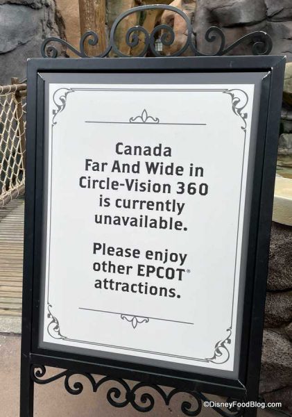 The Canada Far & Wide in CircleVision 360 film hasn’t been playing for a while, since the Appleseed Orchard booth for EPCOT’s Food and Wine Festival is using the space.