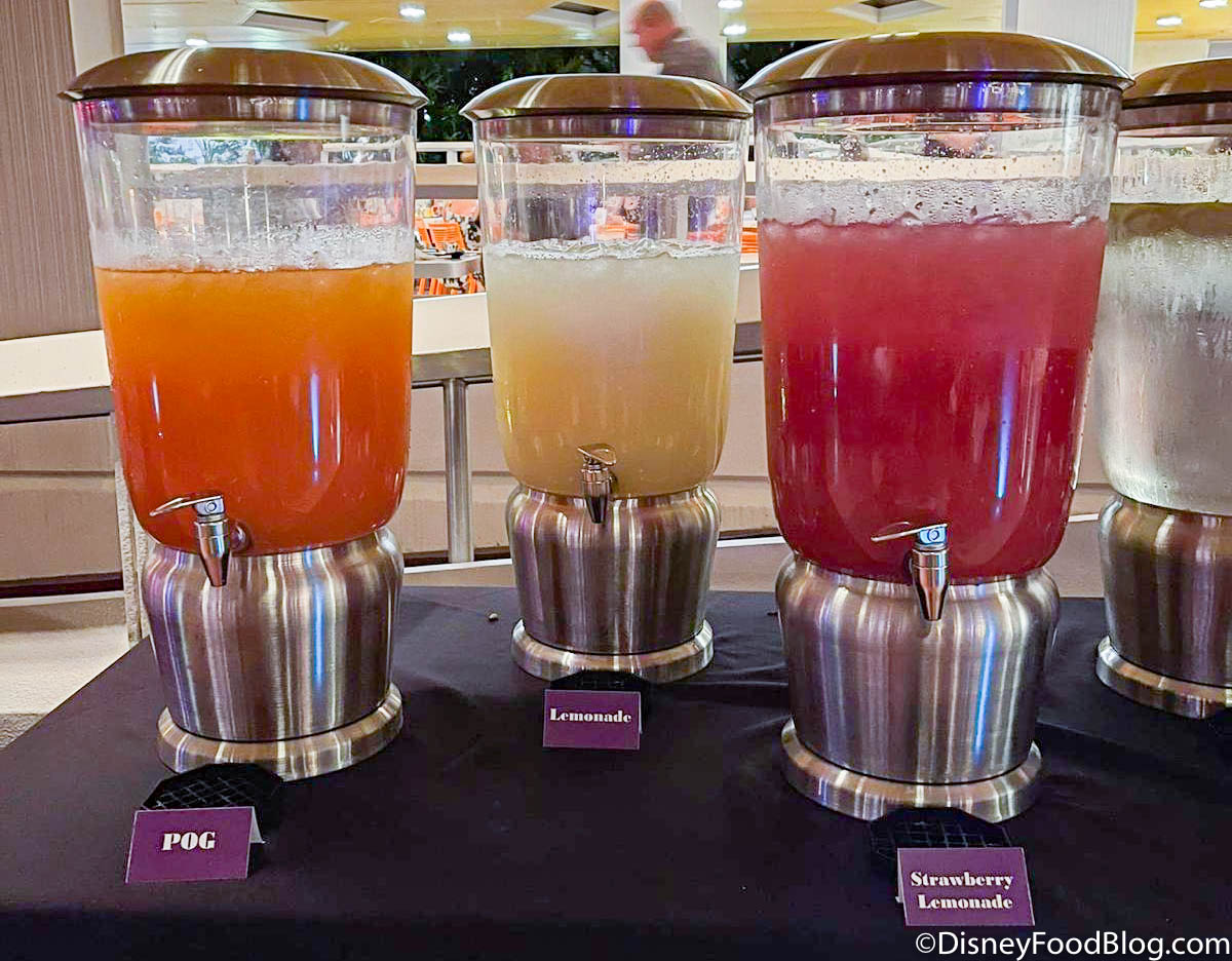 …the infamous POG juice, lemonade, and strawberry lemonade. We were rather surprised that the water option had lemons in it (if that’s not something you like, you’ll want to keep that in mind), and we were surprised that there were no Coca-Cola products available. Having regular water without lemons and more soda options is something we would have liked to have seen.