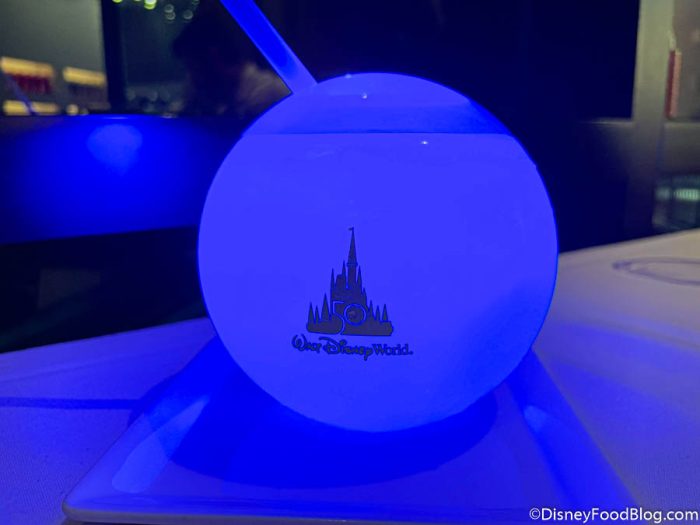 AND we checked out one of the kids’ meals! Remember that this one is $39 per kiddo. We picked up one of the upcharge beverages to go with our meal. We chose the Stardust Sipper for $11. This drink is made with Ceylon Tea with hints of Passion Fruit, Pomegranate, and Vanilla perfectly mixed with Sweet and Sour, Mint, and Soda Water. It comes served in a 50th Anniversary Souvenir Cup with a Glow Cube!