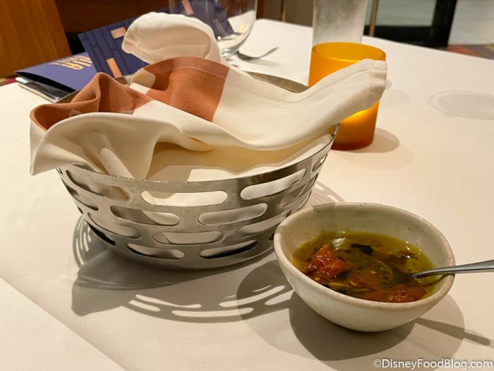 California Grill does feature a bread service at the start of your meal. This spot used to have sourdough bread but is now serving Focaccia Bread with their Signature Dipping Oil. The oil is mostly seasoned olive oil with some sundried tomatoes mixed in.