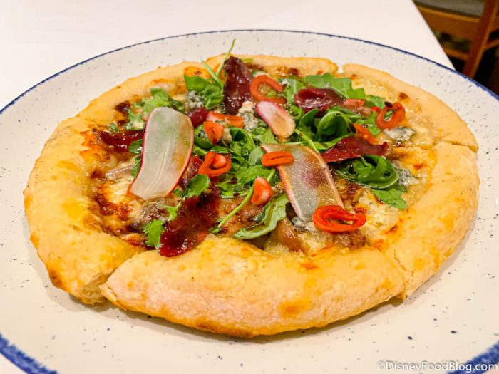 Movin’ on to the first course — the Market Inspirations. We snagged the House-made Artisanal-style Duck À L’Orange Pizza.