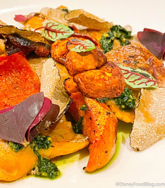 This dish is composed of Chanterelle Mushrooms, Honeynut Squash, Herbed-Pistachio Pesto, and a Truffle-Mushroom “Cream.”