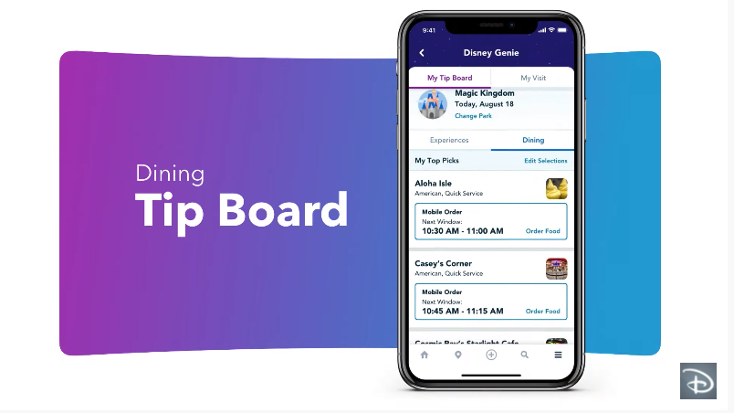 The dining board shows you everything available for Quick Service and Table Service restaurants, so you’ll be able to see the next order window at Quick Service spots and the reservation availability and walk-up list status at Table service restaurants. Warning! If Genie says a spot is unavailable, tap into its page to check for sure. We’ve sometimes seen the dining board say there’s no availability when there IS availability. Genie will also remind you about when your window to make advanced dining reservations opens before your trip.