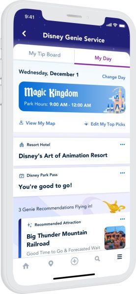 Disney Genie is a free service available on the My Disney Experience app. It works to simplify and personalize your park experience, giving you suggestions based on the interests that you select in the app. It also provides real-time updates on things like weather closures.