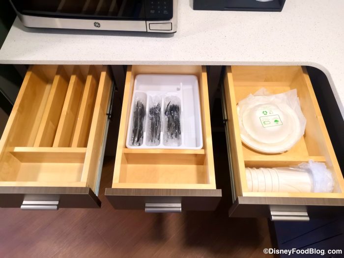 In the kitchen, you’ll find plenty of room in the fridge, so you can store all your leftovers or brought-from-home snacks here. In fact, this is one of the larger fridges available in a Disney World hotel room. The ones in the family suites at Disney’s Art of Animation Resort are mini-fridges.