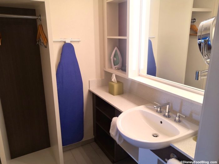 …along with an ironing station and a closet for hanging clothes. There are a few shelves beneath the vanity and to the side for storage.
