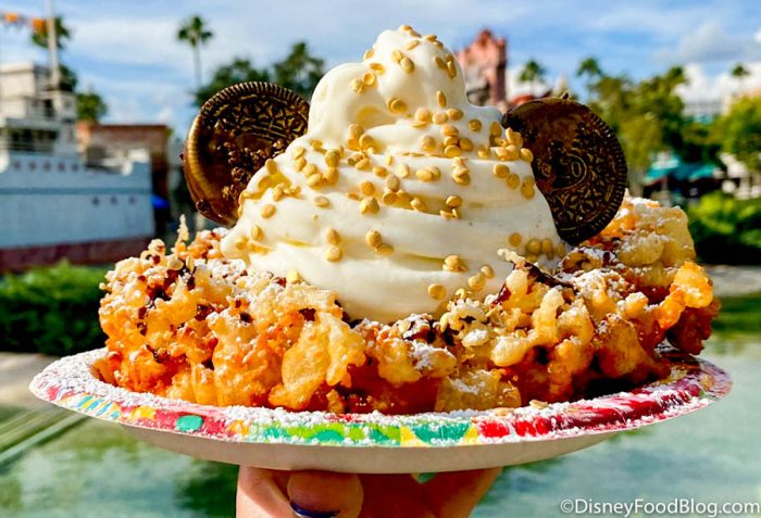 We won’t pass up the opportunity for a warm and sweet funnel cake in Disney World! And, the Glimmer and Shimmer Funnel Cake is a fancy, 50th anniversary version of the Cookies and Cream Funnel Cake that’s golden, crispy, and piled with lots of toppings! You can enjoy soft-serve vanilla ice cream, gold-dipped Oreo Cookies, sprinkles, powdered sugar, and chocolate sauce on top of the funnel cake… but you’ll totally need a few friends to finish it!