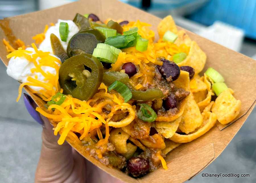 This snack is corn chips covered in Walt’s favorite chili, cheddar, sour cream, and green onions. Jalapeños aren’t listed in the description, but our pie came with a few on top!