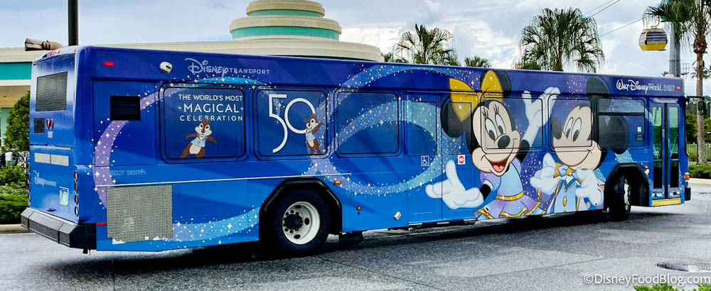 There are new shows, rides, merchandise, and (our personal favorite) LOTS of snacks and treats that have all debuted with the start of the 50th Anniversary festivities. Disney World transportation even got in on the action with some decorated monorails, Skyliners, and buses. But the 50th Anniversary-themed bus isn’t the only one that gets to celebrate the big occasion!