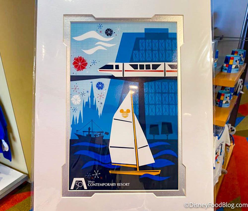 If you’re a collector (or just a big Contemporary fan), you can also get a print of the resort. The print has silhouettes of the resort, Cinderella Castle, a sailboat, and the Monorail, as well as silhouettes of Mickey and Minnie on a boat in the background.
